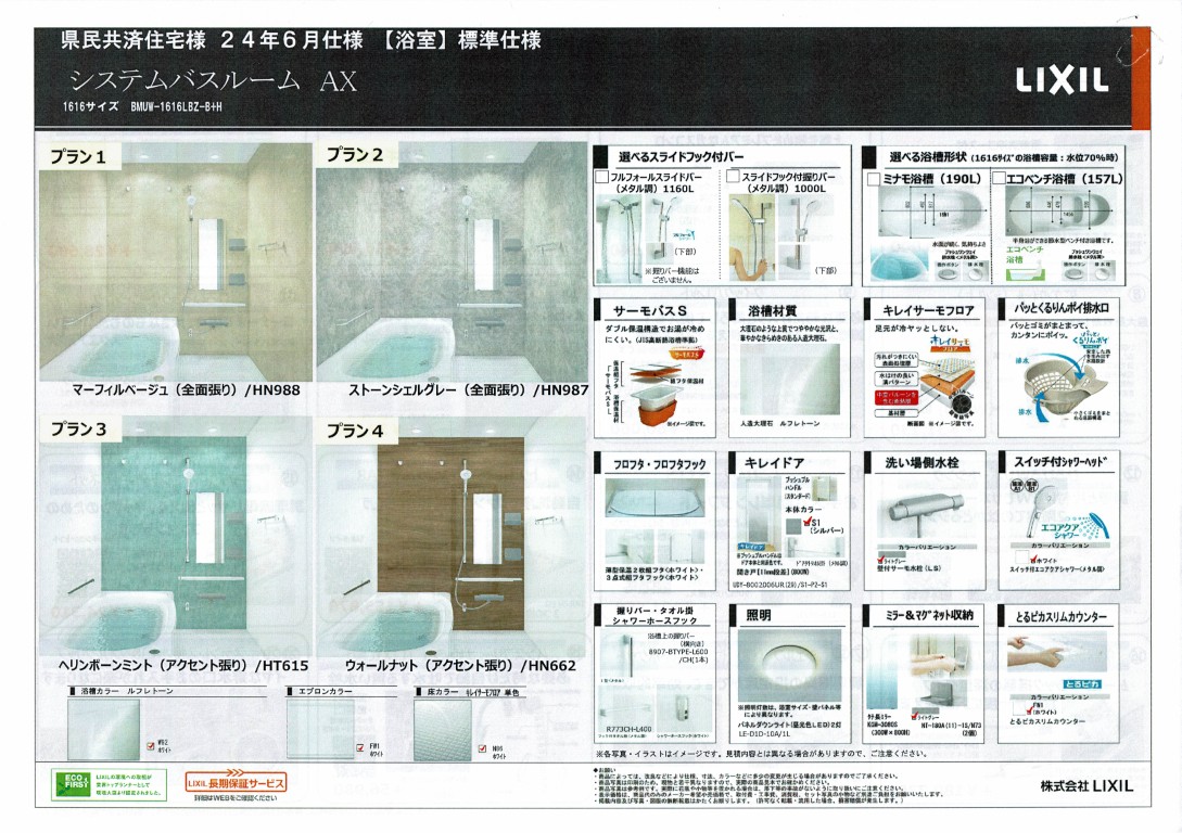 県民共済住宅の標準のユニットバスは、リクシル、TOTO、積水ホームテクノの3社です。(2025年現在)