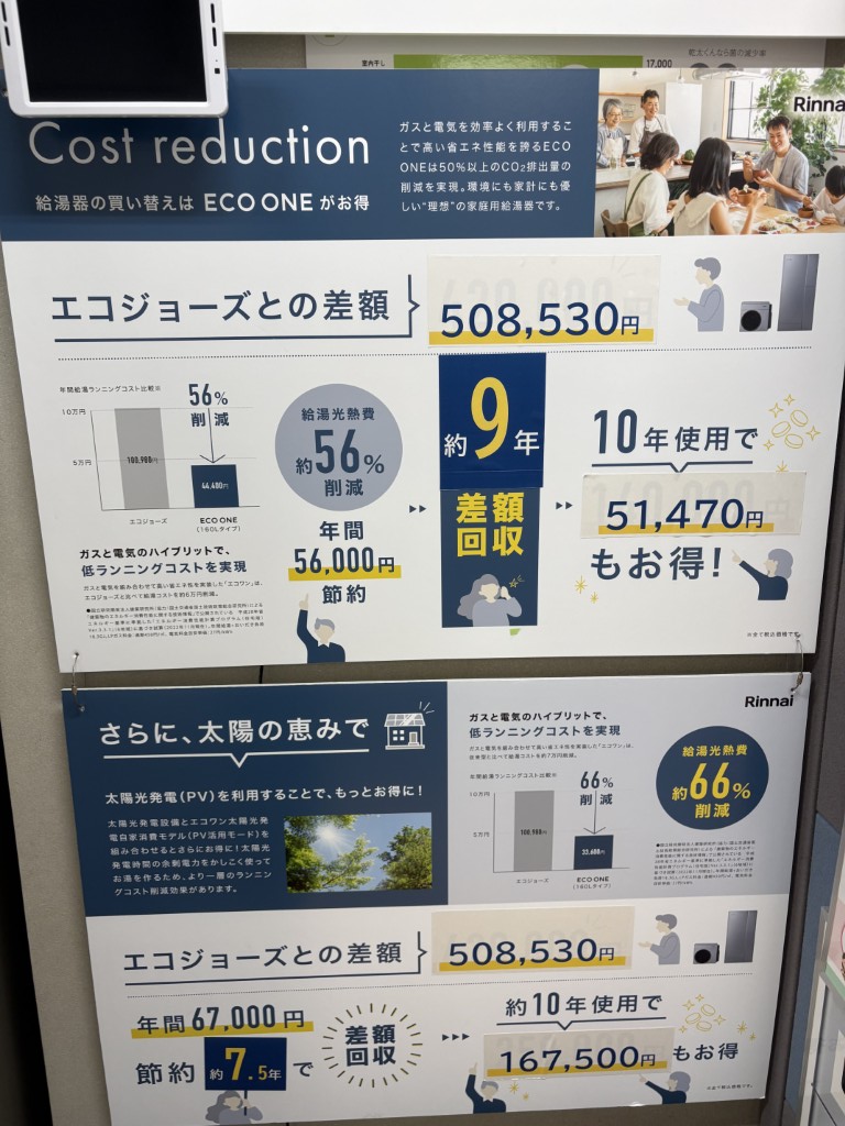 エコワンは、湯切れの心配がなく、水圧も弱くなく、太陽光発電とも相性が良いのが魅力です。