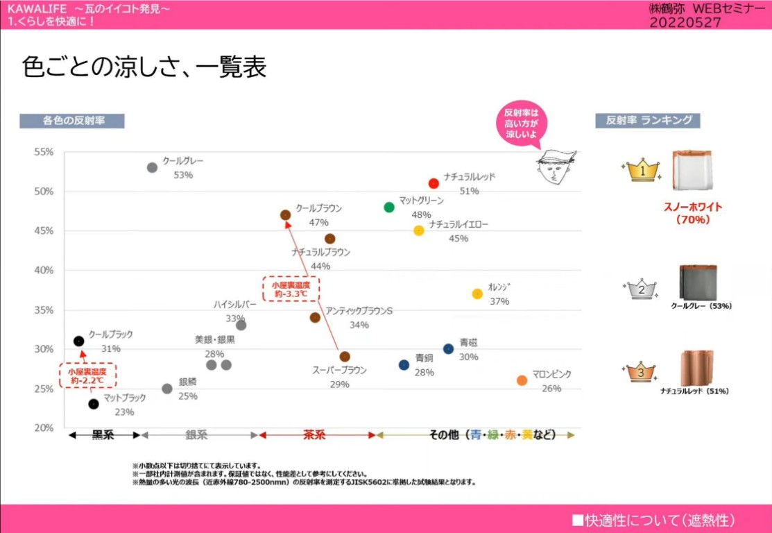 (株)鶴弥のYouTube動画に瓦色別の反射率が出ていました。(34:06~)